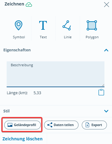 Sie können an verschiedenen Stellen im BayernAtlas durch einen Klick auf den Button Geländeprofil sich das Geländeprofil – einen senkrechten Schnitt durch das Gelände – entlang einer Linie oder Strecke anzeigen lassen: beim Messen, beim Zeichnen, beim Routing.