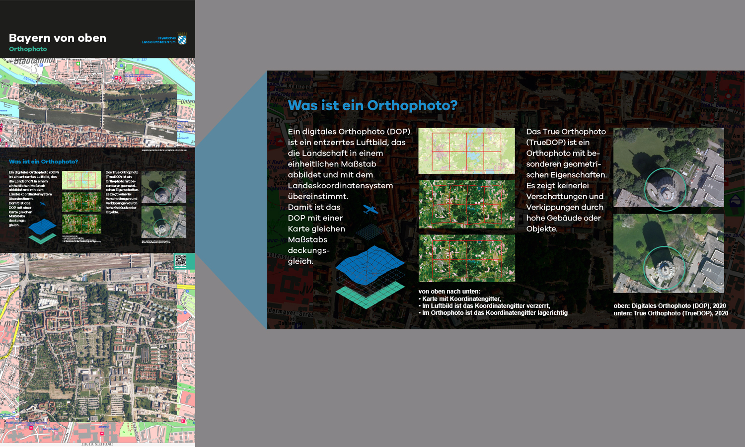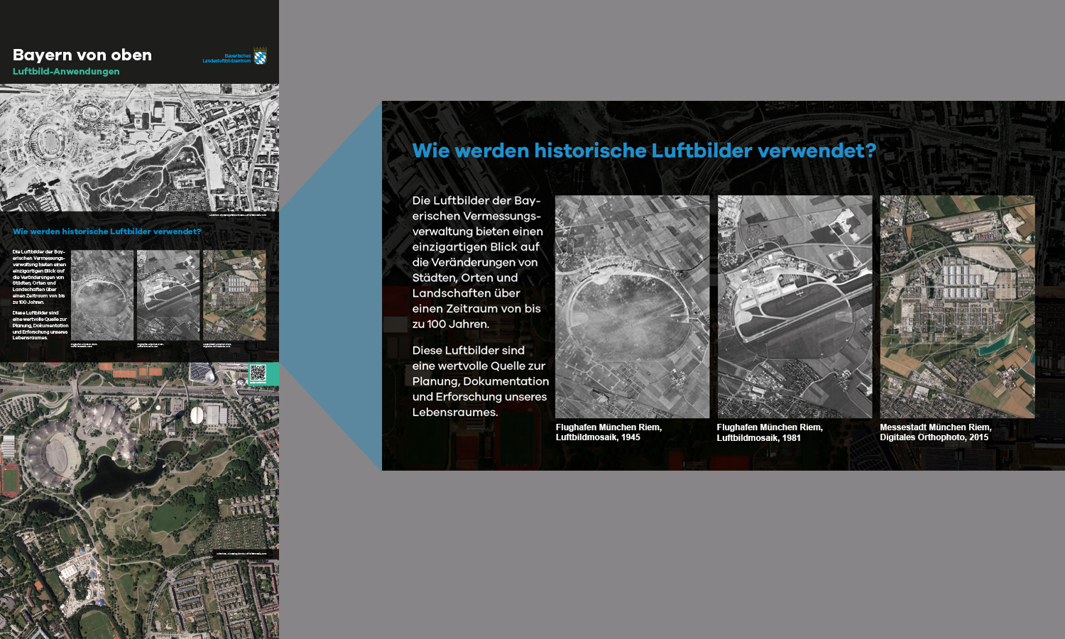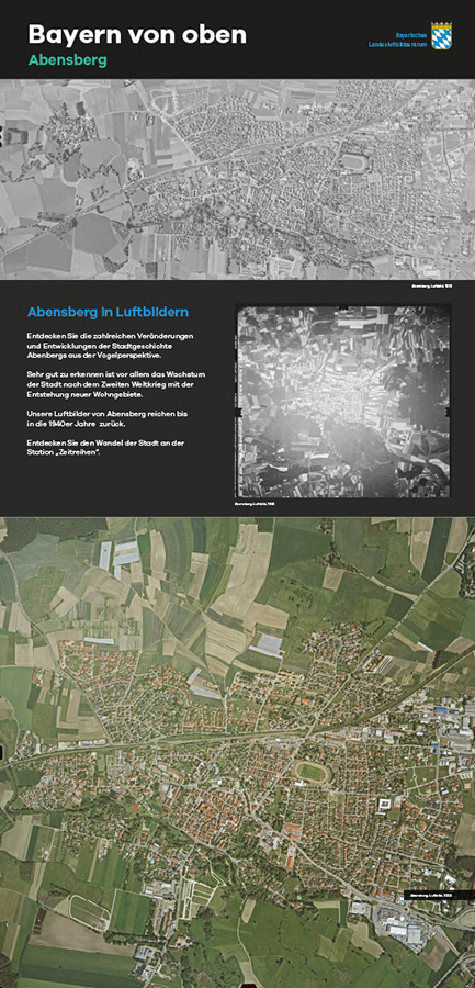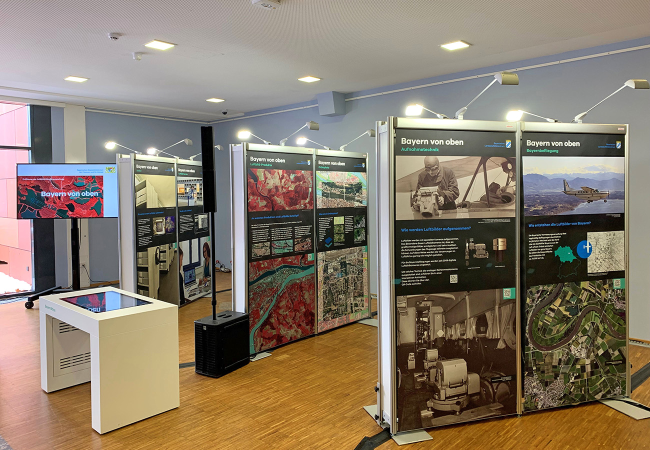 Anlässlich des fünfjährigen Bestehens des Bayerischen Landesluftbildzentrums stellte die Wanderausstellung dessen Angebote einem breiten Publikum vor. Die multimedial gestaltete und leicht verständlich aufbereitete Ausstellung vermittelt einen spannenden Einblick in die Geschichte und Technik der Luftbildfotografie. Auf 14 Ausstellungstafeln wurde den Besucherinnen und Besuchern gezeigt, wie Luftbilder gemacht werden, wie sie aufbereitet werden und wo sie eingesetzt werden.